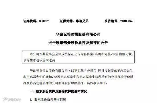 华谊兄弟于6月6日发布公告,宣布华谊兄弟持股人王中军、王中磊的股份质押状况。
