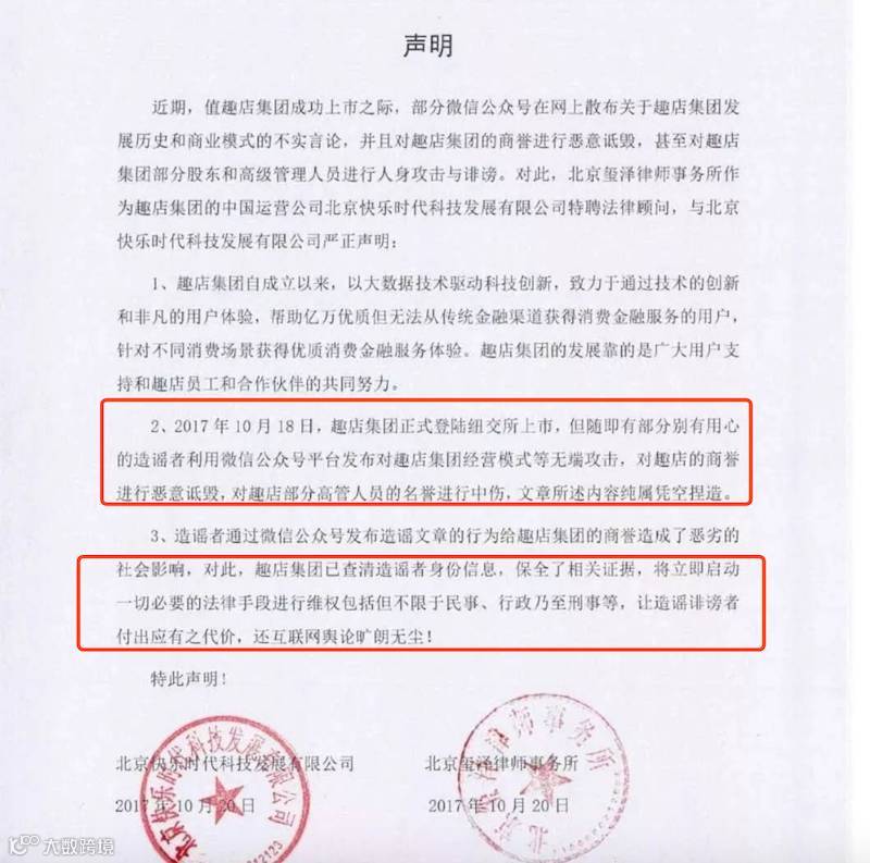 而在几天前,趣店刚因为对自媒体发表的分析文章发表了一篇措辞强硬声明,称要“立即启动一切必要的法律手段进行维权,包括但不限于民事、行政乃至刑事等,让造谣诽谤者付出应有的代价,换互联网舆论旷朗无尘”。