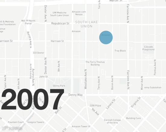 通过查看亚马逊在2007-2017的园区扩张动图,我们也能发现一些规律。2010年,就在亚马逊搬进位于南湖联盟办公中心的第一幢大楼时,公司已经逐渐向接缝处扩展。此时,亚马逊租赁了该地各处的房产,其中还包括修补了几座处于经济衰退期间建造的大楼。