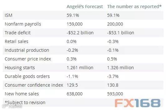 以下是Angele在2月份对各项美国经济指标的预测以及数据的实际表现。