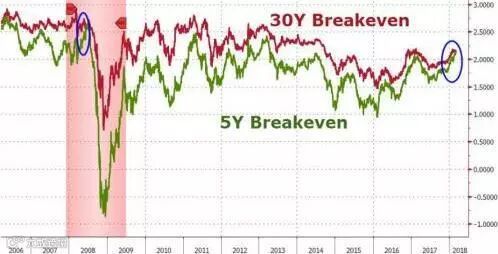 在过去数月内,美国短期(5年)通胀预期飙升至5年来最高,虽然长期通胀预期也在上升,但未能跟上短期区域的增速,这种局面上一次还是出现在2008年第一至第二季度期间。