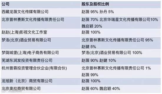 除唐德影视和阿里影业外,赵薇为控股股东、实际控制人所控制的核心企业有如下的9家,其中赵健为赵薇的哥哥,魏启颖为赵薇的母亲。