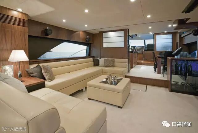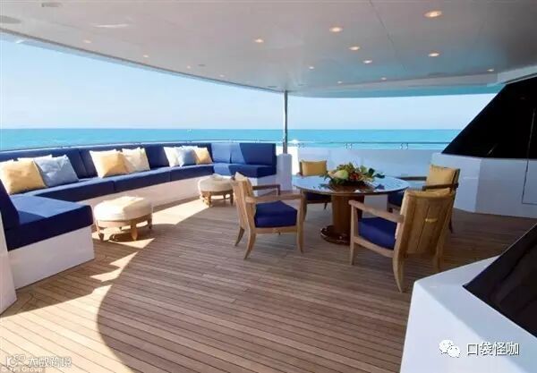 一道凉廊横跨整艘游艇,把主客厅和宴会厅贯通,船尾的弧形结构则装有观景玻璃窗,提供270度无敌大海景。