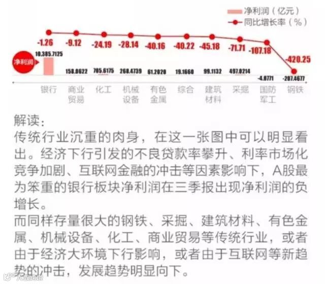 银行、钢铁、采掘、建筑材料、有色金属、机械设备、化工、商业贸易等传统行业,发展趋势明显向下。