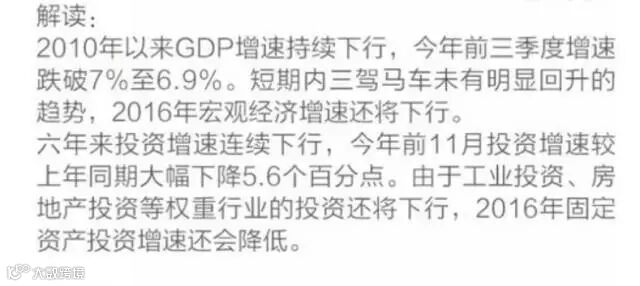 2010年以来GDP增速持续下行,今年前三季度增速跌破7%至6.9%,短期内三架马车未有明显回升趋势,2016年宏观经济增速还将下行。