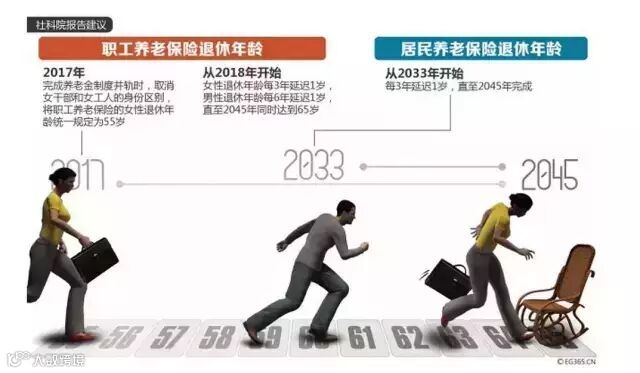 从2018年开始,女性退休年龄每3年延迟1岁,男性退休年龄每6年延迟1岁,直至2045年同时达到65 岁。