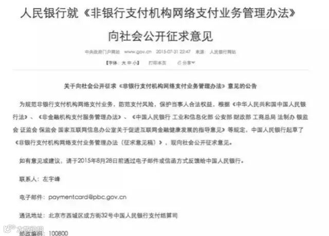 2015 年 7 月 31 日,央行发布了《非银行支付机构网络支付业务管理办法》,并向社会公开征求意见。