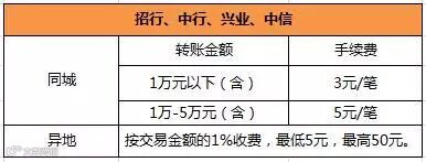去年8月发改委和银监会联合印发《商业银行服务政府指导价政府定价目录的通知》,要求个人柜台转账汇款手续费不得超过50元之后,目前多数银行异地转账、跨行汇款手续费收费通常为交易金额的0.5%至1%,最高50元封顶。大多数股份制银行则按照转账金额收取手续费,1万元以下收3-5.5元,1万-10万元收10.5元,50万-100万元收20.5元,最高也不超过50元。