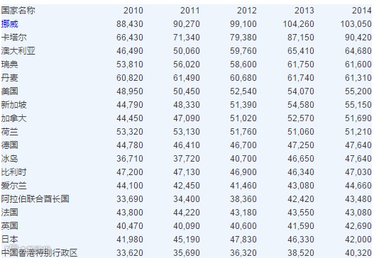 世界各国人均国民总收入排名(美元):