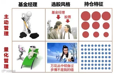 左边第一列有点夸张,不是说量化投资基金经理很闲,这里主要说的是工作模式。主动投资管理的基金经理要不停的挖掘、调研、选股票,靠的是人;而量化投资基金经理更多的是进行数据分析、构建新的模型、研究外方股东有啥最新最先进的模型进行本土化尝试,股票交给模型来挖,靠的是电脑。