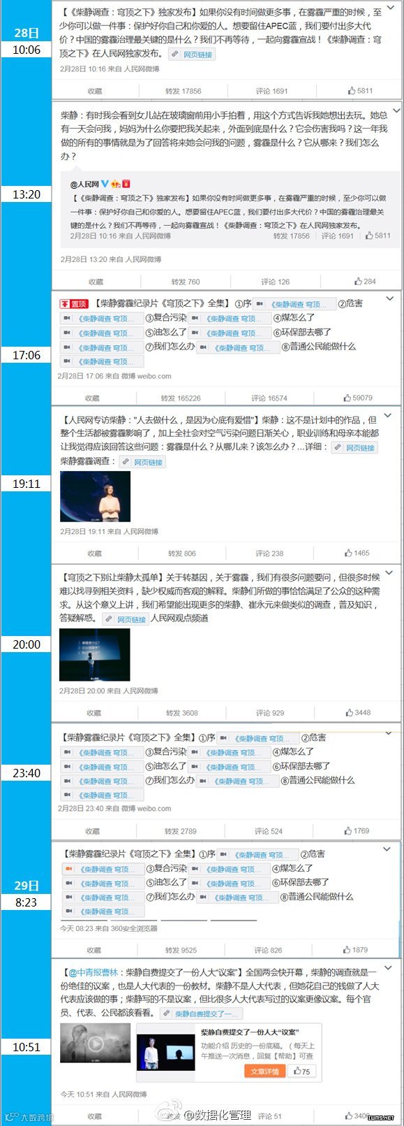 世界上从来没有无缘无故的热点,都是在恰当的时间,合适的传播渠道通过最佳人选的组合打一场有准备的舆论战。大家还记得当时公布周老虎的时候,短短数小时各种深度报道,数据分析就满天飞了吗?这次是27号15:26人民网公布环境保护部部长被免,28号8:09穹顶之下视频第一季就被上传到人民网,9:01人民网和优酷同时发布【穹顶之下】的视频,并且人民网还是以专访的方式,10:02柴静的官微@柴静看见 发布视频消息,可见准备还是很充分的。
