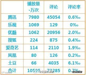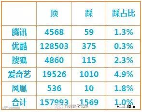 视频网站一般都设计了供大家表达情绪的顶和踩,乐视没有查到该数据,土豆只看到了顶而没有踩,所以这两家不统计这个数据。通过计算踩占顶加踩的比重,发现爱奇艺的踩的比例最高,达到了4.9%,优酷最低。几大网站总体保持1.0%的比重。这应该是比较正常的一个水平。