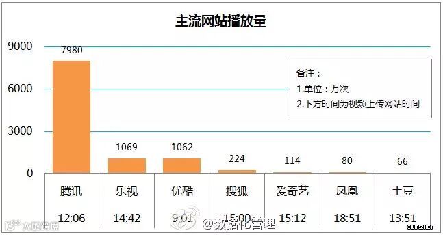 腾讯借助了微信推送所以播放次数遥遥领先,乐视有点逆袭的感觉,不在图中的新浪视频播放量不到23万次,网易视频貌似只有可怜的几千次。人民网的播放次数应该也非常可观,但是看不到他的具体数据,一个遗憾。
