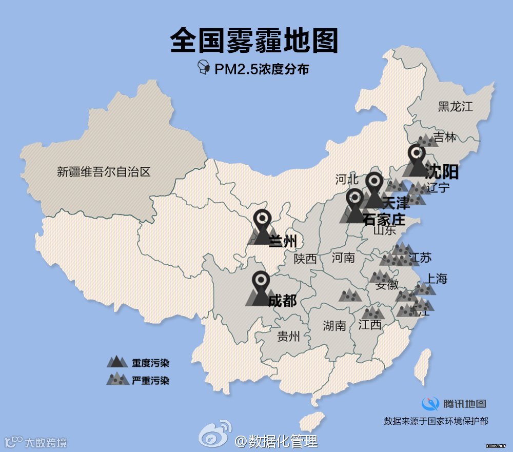 涉及到环雾霾的这种民生问题,自然是老百姓关注的大事,所以这件事能火起来关键还是内容。昨天在腾讯地图看到了这张结合柴静雾霾调查做的全国雾霾地图,美丽的成都也严重污染了,哎。