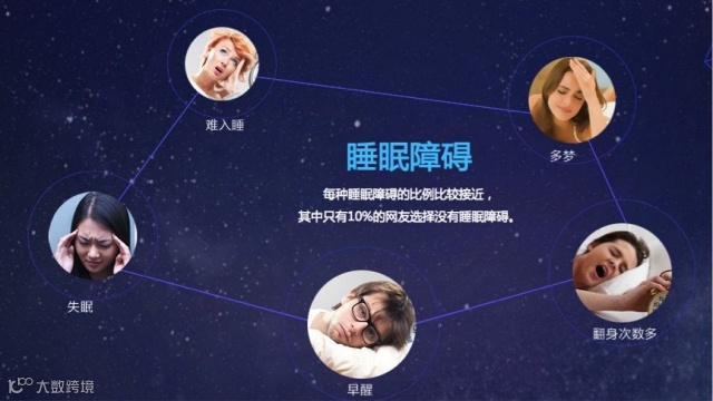 看,现代人很少能从睡眠中得到享受。在46000个样本中,只有 10%的受调查者选择没有睡眠障碍,其他90%的受调人群都受到难入睡、多梦、失眠、早醒、翻身次数多等睡眠障碍。可见,对很多人而言,睡眠这件“小事”,好像正在从一种享受变成多种折磨。