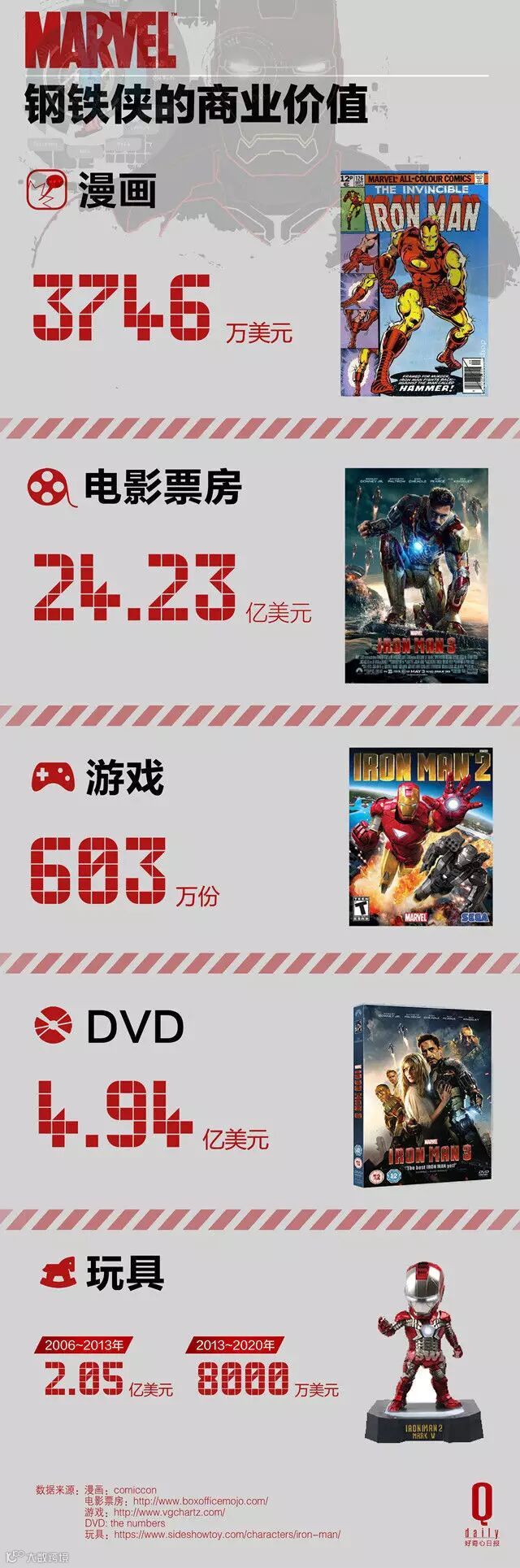 这些超级英雄的的“身价”可比我们想象当中高多了。比如以《复联》中的主力钢铁侠为例,它的三部电影创造了 24.23 亿美元全球票房,除此之外,还有 4.94 亿美元的 DVD 收入,3746 万美元的漫画收入,以及卖出的 603 万份不同类型的游戏。