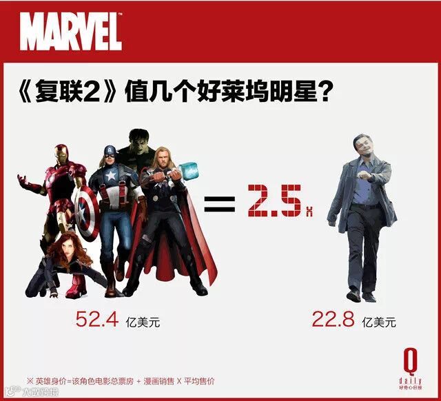 当我们把《复联 2》里这些主力们创造的“财富”相加时,发现这个阵容的总身价达到了惊人的 52.4 亿美元。根据 The Movie Times 的计算,好莱坞一线男星莱昂纳多·迪卡