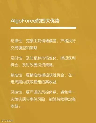 AlgoForce量化交易系统——主要是基于对金融市场各类交易标存在的波动率、相关性、交易报价与交易资金等一系列有效数据收集后,使用自主研发的各类数学模型进行分析判断,最终通过算法交易有效地消除系统风险,实现稳定套利与绝对收益,相比起实盈的Quantum Box系统,Algo Force收益率更稳定,风控更严谨(最大回撤率仅为10%)。