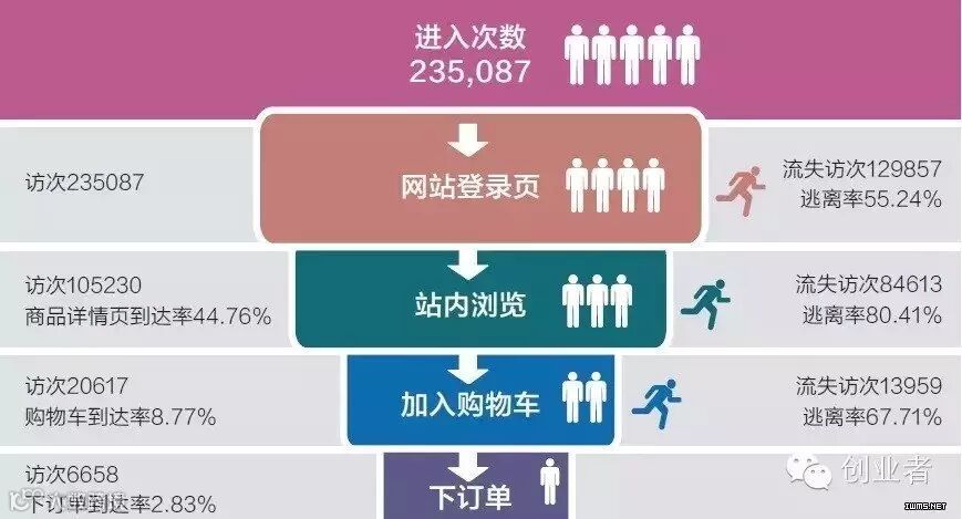 分析引擎可以作为一家电商平台的“诊断环节”,通过后台数据的获取,如漏斗模型所示,电商将了解用户在购物的不同环节中的逃离率,从而更直观地了解应该在哪一环节进行优化。同时,分析引擎还可以获得访客的地区分布、到访时间段分布与新老访客占比分布。