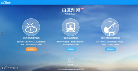 实际上,除了“景点舒适度预测”之外,未来百度预测还将推出城市旅游预测、感冒流行趋势预测、高考考研预测、就业预测、房地产预测、金融预测、世界杯预测、票房预测等更多细分领域的大数据预测产品。