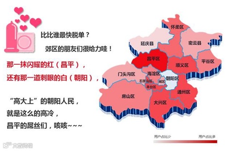 在京东的这份数据里,性福指数分析占据了很大篇幅,北京城区性福指数对比结果是,昌平区性福指数最高,朝阳区居然是一片灰白色,性福指数是最低 的。按道理讲朝阳区北京夜生活最丰富的地区了,曾经的天上人间,灯红酒绿的三里屯都在这里,双十一朝阳区的青年们都跑哪里去了?