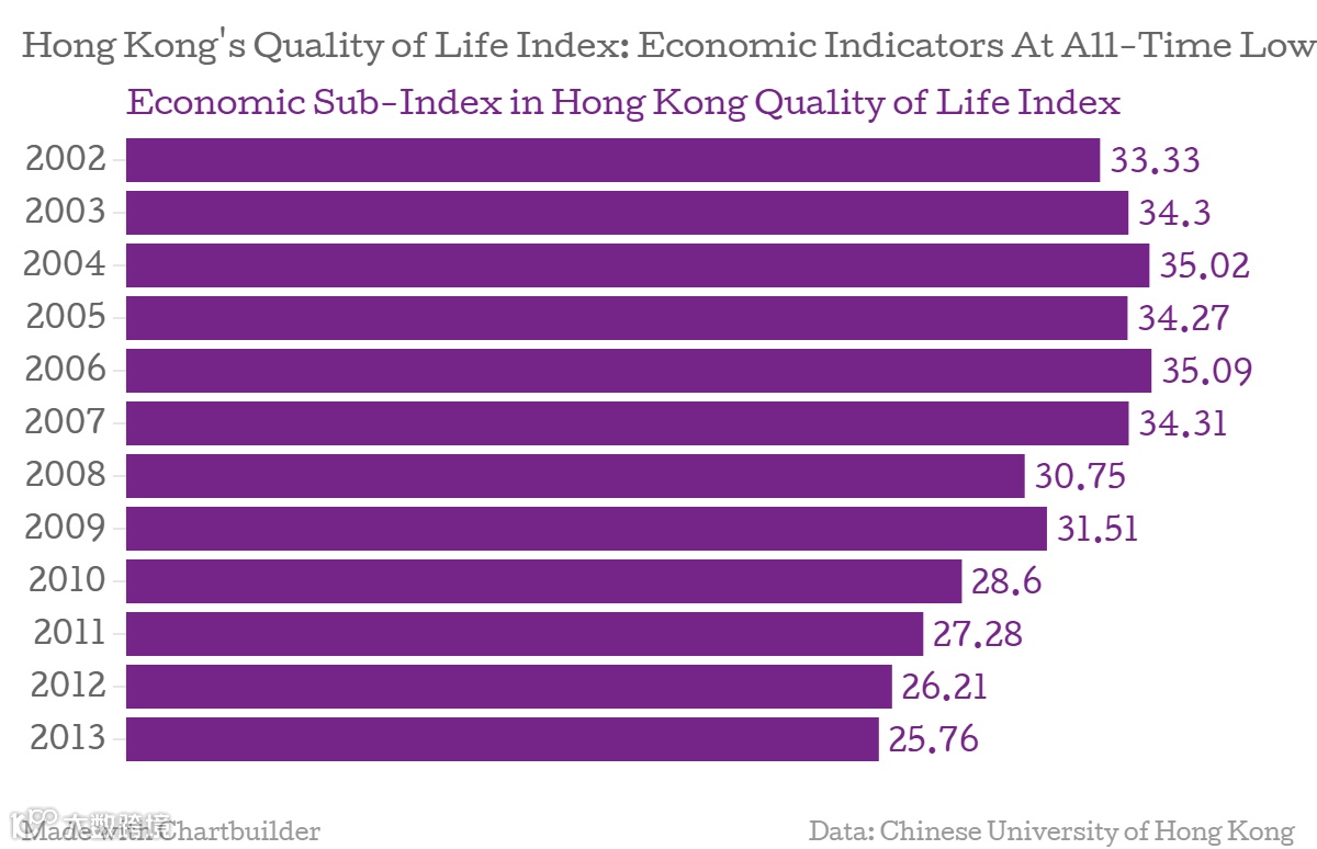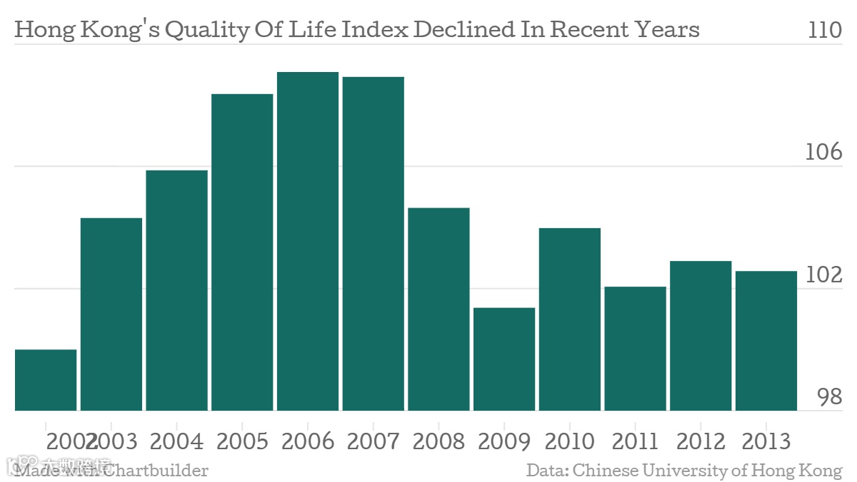 根据香港中文大学编制的一份指数,香港居民的生活质量自2007年以来大幅下滑。在从空气质量一直到平均寿命在内的21个指标中,7个经济指标的分类指数录得自2002年以来的最低值。除了房价承受力大幅下滑,实际租金指数这几年也急剧恶化。
