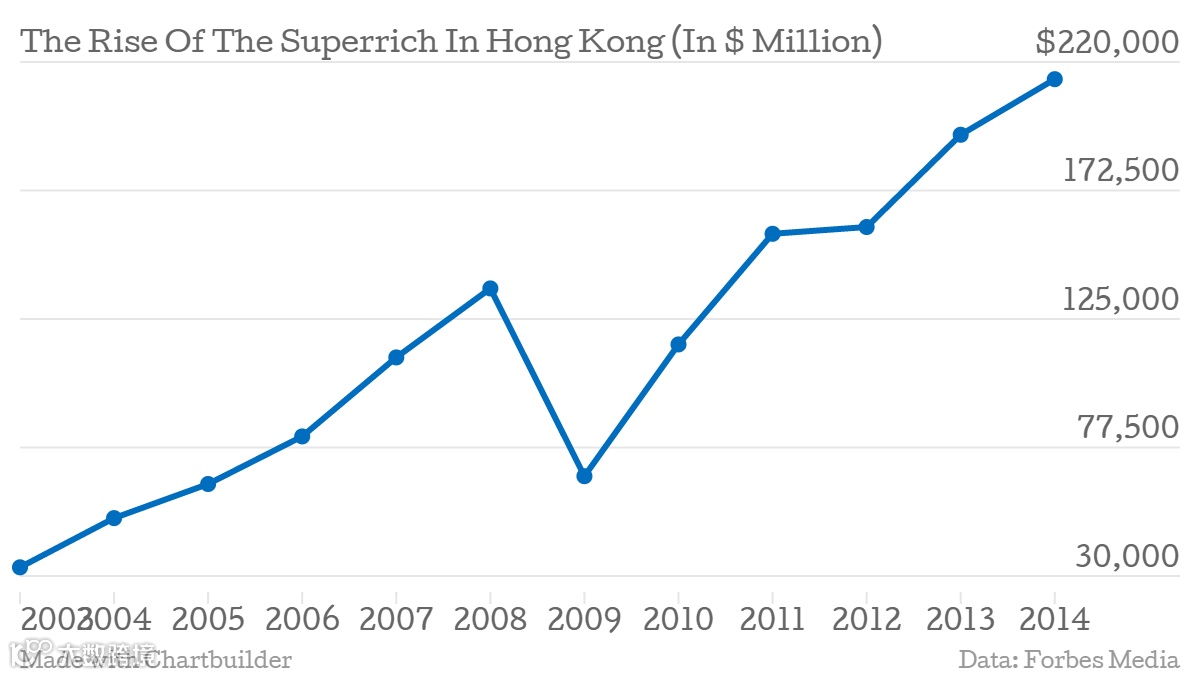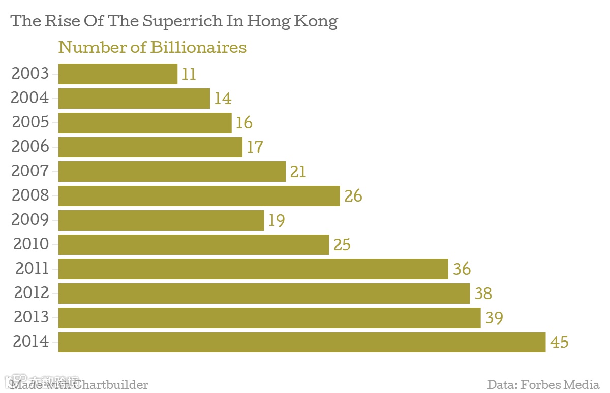 虽然130万香港居民生活在贫困线之下,但最上层的1%人口却越来越有钱。2014年的福布斯全球富豪榜上,香港的亿万富豪数量达到创纪录的45人,他们的个人净资产加起来达到2140亿美元。根据世界银行的数据,这几乎相当于香港2013年GDP的80%。
