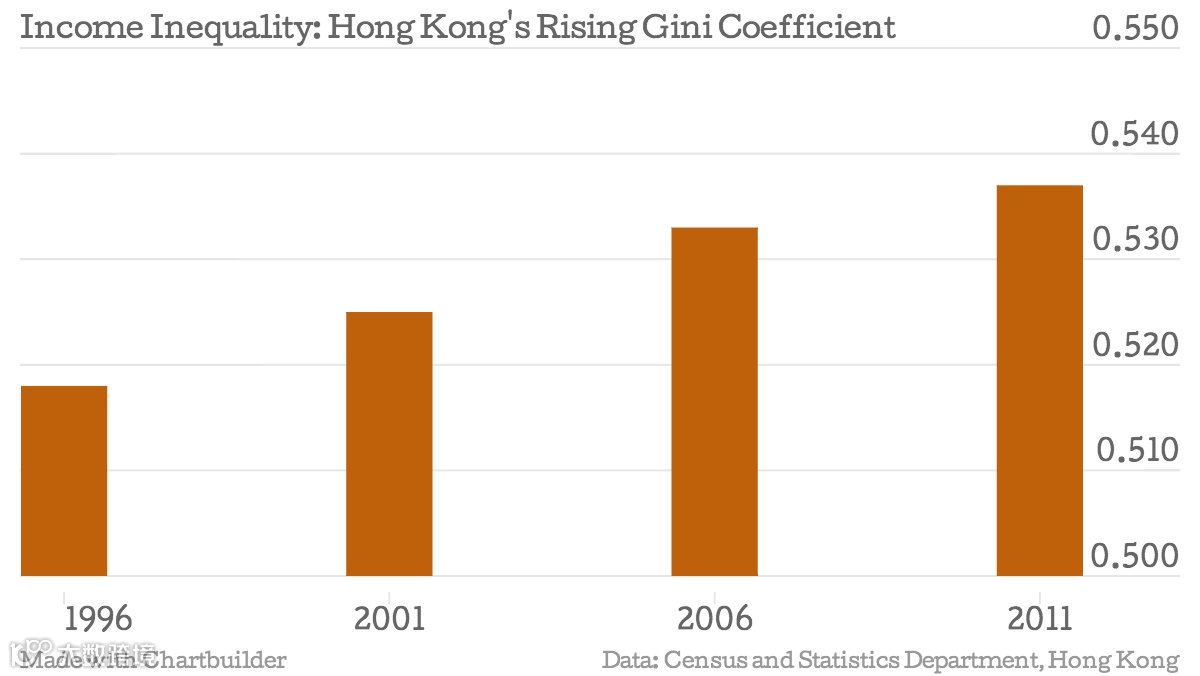 香港的基尼系数——基于原始家庭收入数据衡量收入分配差异的指标——在最近几年升至创纪录的高位。香港政府统计处最近发布的统计数据显示,香港的基尼系数在2011年达到0.537,比1971年的0.43升高了25%。它正在追上中国大陆,根据密歇根大学研究人员的统计,中国大陆的基尼系统约为0.55。