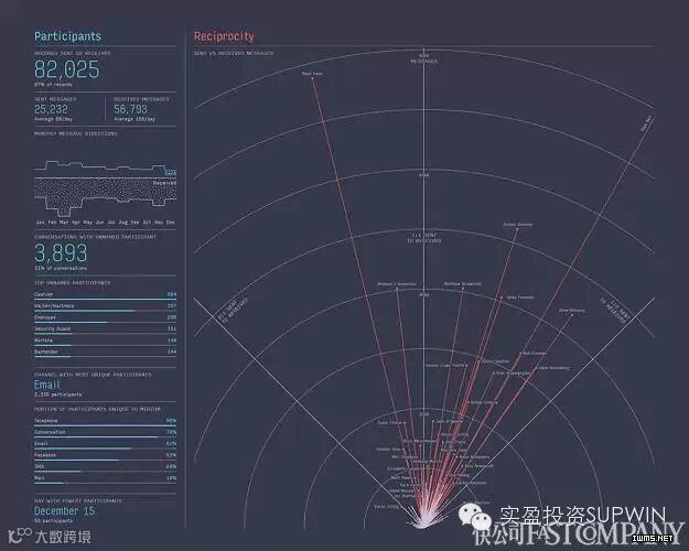 在 2013年,一位执着于自我数据监控的狂人尼古拉斯·费尔顿(Nicholas Felton)记录下了在一年中他与其他人交流的所有数据,包括短信、Facebook留言、电话、邮件、平信、说话和肢体语言。经过汇总统计,他与其他 人总共有94,842次接触,说了7,673,242个字。根据统计信息,费尔顿制作出了量化图表,让我们看到了现在通讯的惊人发展,用他自己的话说“我 们的祖先肯定想不到通讯会变得如此发达。”