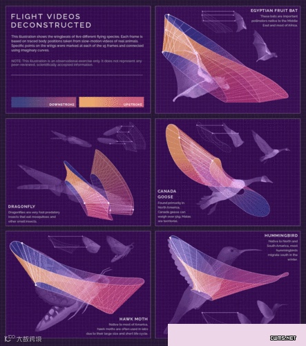 22 岁的西雅图艺术家埃莉诺·卢茨(Eleanor Lutz)在大学的昆虫研究室工作室产生灵感创作了这一图表。卢茨用直观的图表展现了不同种类有翅膀的动物是如何飞行的,记录的动物包括蝙蝠、蜻蜓、黑额 黑雁、蜂鸟和鹰蛾。卢茨仔细观察了这5种动物飞行时的慢动作录像,然后记录下飞行中每种动物翅膀关节的位移情况,这些位移很难直接用肉眼观察到。翅膀煽动 最快的要数蜂鸟了,一秒钟大约会动200次。