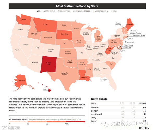 你 有没有想过有些在你看来再正常不过的饮食习惯在其他地区的人看来却是十分诡异的?Co.Design版块的可视化数据设计师格斯·文茨瑞克(Gus Wezerek)和作家马克·威尔逊(Mark Wilson)与一家食品业资讯公司Food Genius一起合作,研究了8万8千份菜单和5千9百万个菜品制作出了这份美国各州最有特色的食品图表。这份图表中的食物并不是每个州最受欢迎的菜式, 而是本州最有特色、独一无二的菜品。图表中还体现出了各地区5大类特别的饮食爱好,包括费城牛肉芝士三明治、青辣椒、灯笼椒、牧场沙拉和山核桃。图表统计 的很全面,给我们展示了很多我们之前不知道的美国饮食文化。