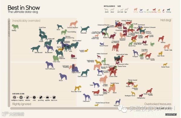 伦 敦资讯类记者兼设计奇才大卫·麦克坎德莱斯(David McCandless)前些年创作了很多深刻的视觉化数据作品,而这一次他选择了一个比较轻松有趣的主题:从量化分析角度来看,哪个犬种最好?根据对犬种 优点(智商高、寿命长、无遗传疾病)和缺点(饲养花费、美容费用、食量大)用数学方法做分析,麦克坎德莱斯的图表给各种犬类做了排序。没想到现在做狗竞争 压力都这么大啊。