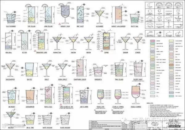 工程师山恩·赫尔利(Shaan Hurley)用AutoCAD软件制作了一款调酒教程。在图表中,赫尔利解构了包括汤姆柯林斯(Tom Collins )和激情海滩(Sex on the Beach )在内的70种不同鸡尾酒的做法。图表按是否含有威士忌分类,可以下载下来用AutoCAD查看。