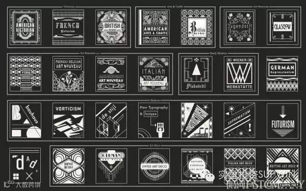 Pop Chart Lab是数字化信息图表界的佼佼者,总能做出令人叹服的图表,这张平面设计史图表也保持了它们一贯的出品水准。这张黑白网格图表简直就是个平面设计的微观 史。图中从古至今记录了各种各样的设计流派,从维多利亚时期的到现代的(包括鲍豪斯建筑学派、旋涡主义画派、风格派、新文字设计、动态布局、构成主义、绝 对主义和未来主义等),再到当今流行的扁平化设计。每种设计流派下面都备有文字说明,给设计初学者入门和爱好者提供了一个非常好的入门资料。
