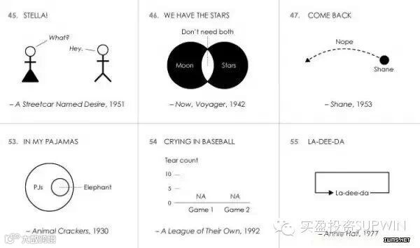 2005年,美国电影学会组织了1500名电影艺术家、影评人和历史学家评选出了100年来好莱坞电影中最令人印象深刻的电影对白。Flowing Data网站的南森•邱(Nathan Yau)把这些对白巧妙的做成了黑白卡通漫画表,图表中更是把各种表格的使用发挥得淋漓尽致,有文氏图、饼图、曲线图、柱形图、流程图等等。很少有人会用这样的形式来诠释语言对话,这也是这个图表的过人之处。