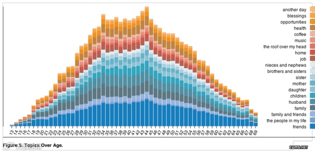 Facebook的感谢图谱显示,“在各个年龄阶段,好友一直是人们感谢的对象之一。在20岁之前,‘丈夫’并未出现在这份图谱之中,但是在30岁之后,‘丈夫’出现的几率开始逐渐减少。此外,随着年龄的增大,‘健康’被提到的越来越多。”