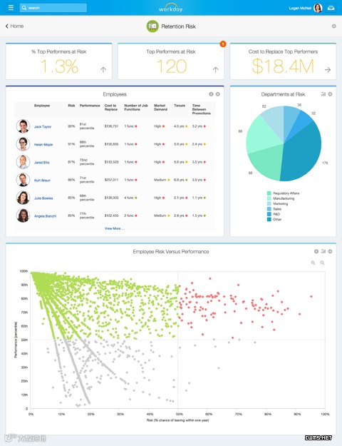 Workday 声称这个新工具可以预测可能会在未来一年内离职的优异员工,还能建议企业要如何留下这名员工,譬如为其加薪或是换工作内容。Workday 的财务支出报告软体,还可以预测哪些员工的薪资可能会超过公司预算。