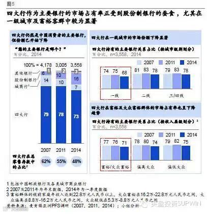 中国“四大”银行主导地位走弱(四大国有商业银行指包括中国银行、中国建设银行、中国工商银行及中国农业银行)。例如,在不同级别城市及各收入群体中,四大银行的市场占有率均在下降。
