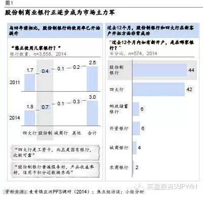 麦肯锡说,中国的四大行主导地位走弱。那么,“逃离”四大行的用户去了哪里?股份制商业银行,以及城市商业银行、农村商业银行,当然还少不了外资银行。这是四大行的主要竞争对手。其中,股份制商业银行所占的主要行关系市场份额从2007年的6%上升至2014年的16%。