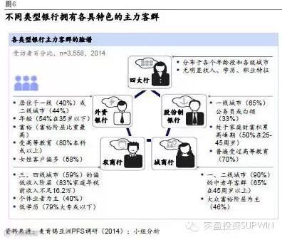 股份制商业银行吸引了一线城市相对较富裕、受过良好教育的客户。外资银行吸引的富裕阶层及本科以上学历的客户最多。另外,城市商业银行的主要客户为年纪较大的消费群体及一、二线城市大众富裕阶层。最后,农村商业银行的客户主要来自三、四线城市及较低收入群体。