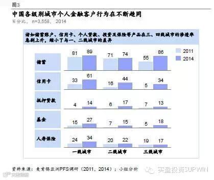 中国各级别城市个人金融业务客户的行为在不断趋同。过去几年,诸如储蓄账户、信用卡、个人贷款、投资及保险等产品在三、四线城市的渗透率急剧上升,缩小了与一、二线城市的差异。(见图3)