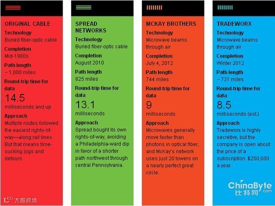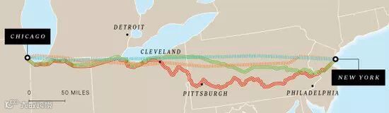 然而,并不是所有的股市交易都在纽约进行。受历史背景影响,诸如期权和期货在内的美国股票衍生产品都在距离纽约720英里以外的芝加哥商品交易所(Chicago Mercantile Exchange)进行交易。因此在几年前,一家名为Spread Networks的公司开始悄悄地穿越公共用地埋设光缆,使芝加哥商品交易所和纳斯达克位于新泽西州Carteret的主数据中心之间距离缩短了140英里。现在的光缆网络基本是沿着铁路沿线进行铺设的,而且都是针对公共数据中心进行设计,不能为交易商提供点对点的接入服务。Spread Networks铺设光缆的路线从Carteret起始没有直接向南穿过费城,而是选择向西北方向穿过宾夕法尼亚州中部,然后再向西穿过克利夫兰市。交易延迟时间是按照数据往返时间(比如,从发出指令到接收到确认信息的时间)计算的。