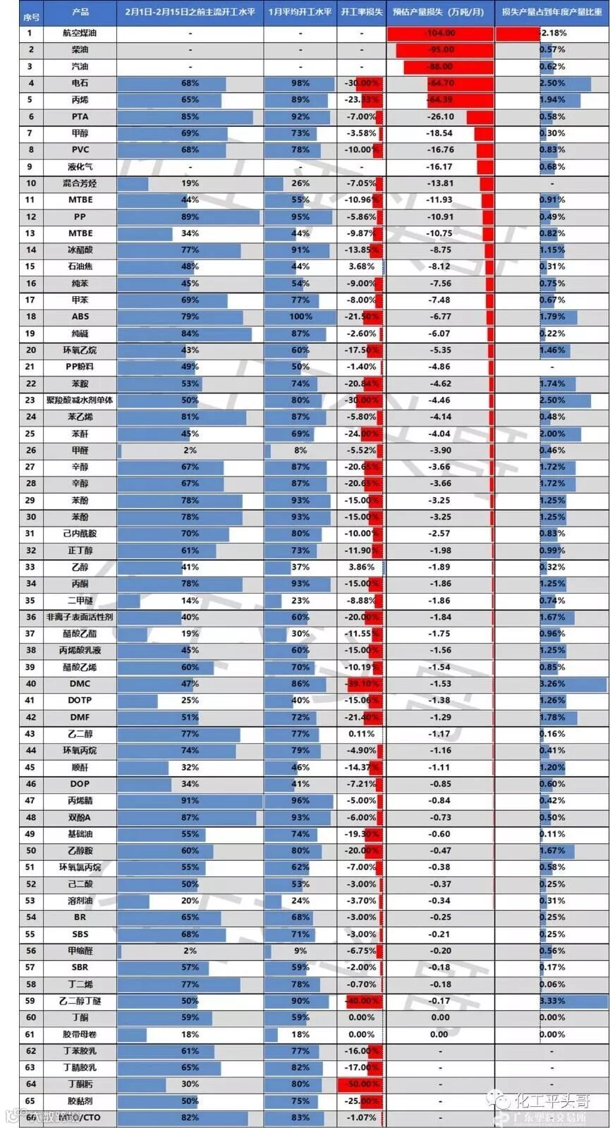 本文整理了65种大宗化学品的开工变化,展示了从2020年1月份至2020年2月份期间,开工水平的变化带来的供给损失,予以综合评判此次疫情给大宗化学品的生产带来的影响。