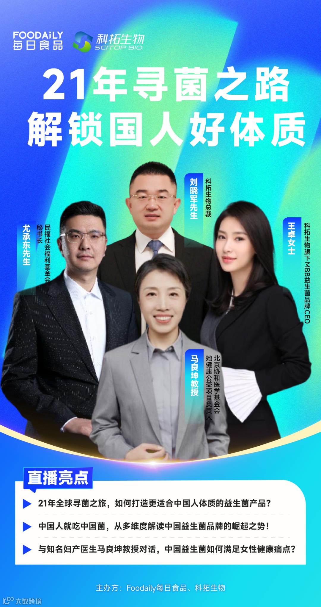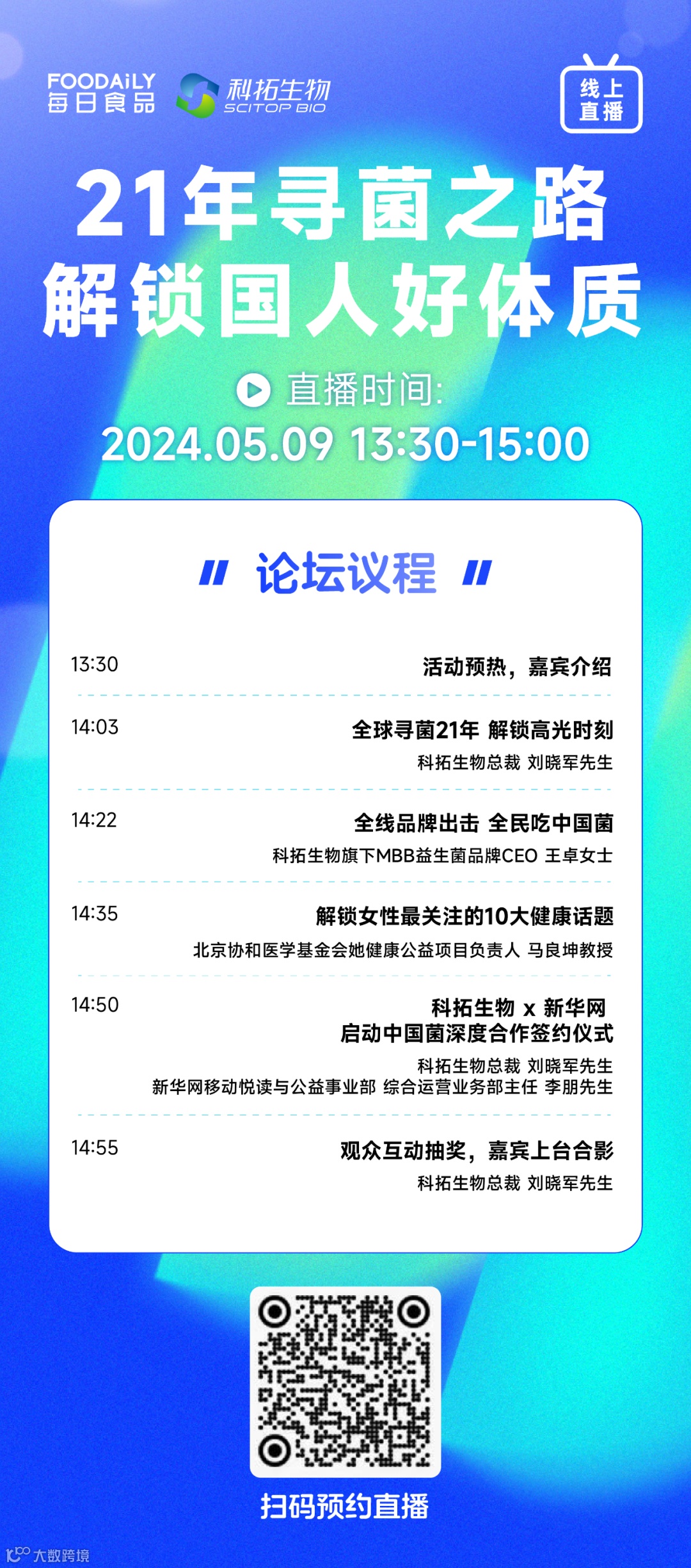 5月9日13:30-15:00,深耕中国益生菌领域21年,成就中国益生菌第一股的科拓生物将携手Foodaily每日食品,在上海国家会展中心举行“21年寻菌之路 解锁国人好体质”发布会。届时,科拓生物总裁刘晓军、科拓生物旗下MBB益生菌品牌CEO王卓、北京协和医学基金会她健康公益项目负责人马良坤教授及民福社会福利基金会秘书长尤承东等多位重磅嘉宾将出席活动,并将基于中国益生菌市场的痛点与解决方案,与参会观众一同探索更适合国人体质的中国菌。