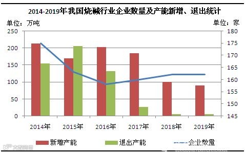 图1 2014-2019年中国烧碱行业企业数量及产能新增、退出统计