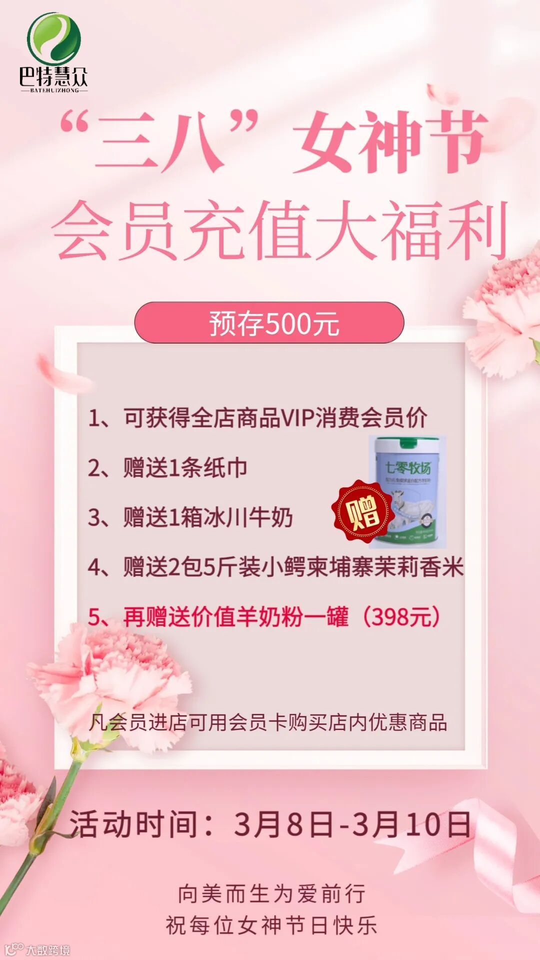 三八节期间(3月8日—3月10日)充值500元,在原有的赠送基础上额外赠送多1罐价值398元羊奶粉