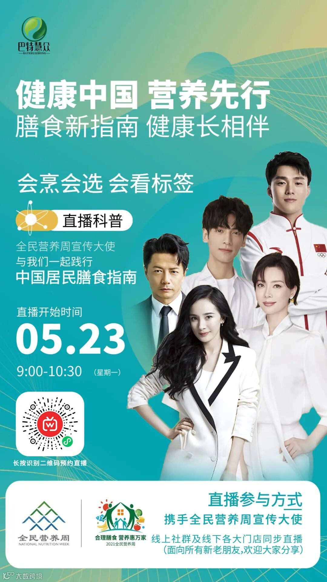 巴特慧众将于2022年5月23日9:00-10:30携手全民营养周宣传大使通过线上社群及线下各大门店面向所有新老朋友同步直播,宣导全民营养周知识,普及日常生活中的饮食习惯,让大家吃出营养健康。