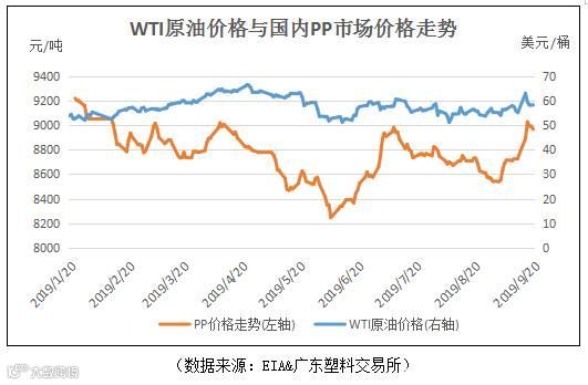 进入2019年9月以来,季节性需求旺季启动令持续下跌的PP(聚丙烯)迎来了止跌反涨的曙光。9月初得益于期货走强的提振效应,PP在中秋节前出现一波小涨,随后在9月14日中秋节期间,中东动荡的局势使得战火再燃,沙特核心油田遭受敌对无人机袭击,使得日产油量缩减一半以上,约占全球整体原油供应量的5%。受该事件的影响,周末结束后油价疯狂做多,也再度将PP价格拉到新的高点。同时,由于国内PP市场处于供不应求的状态,自7月中下旬以来缺货问题一直未得到有效改善,加上两桶油以及港口库存9月基本处于低位运行的状态,助推PP市场价格9月中旬达到月内最高价9025元/吨,涨幅5.70%,PP“金九”迎开门红。