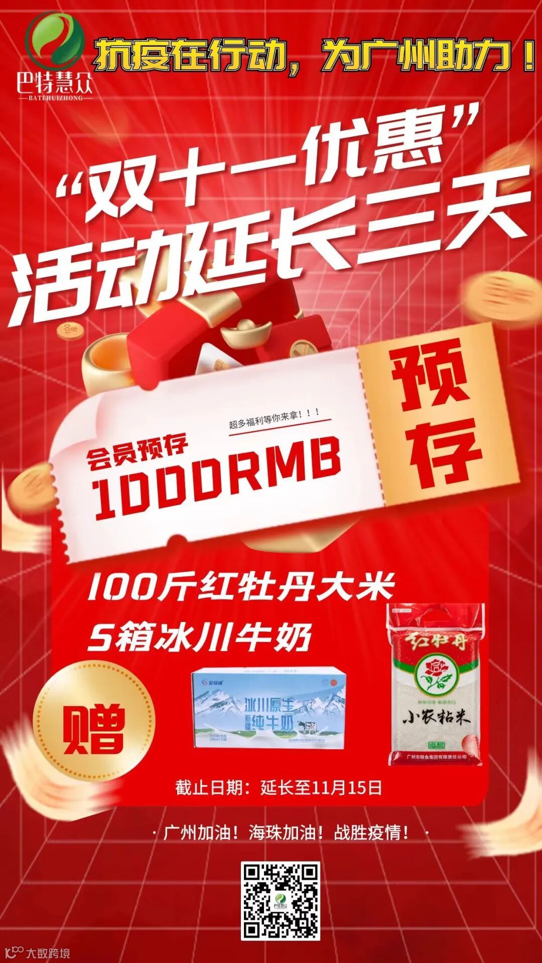 为此趁双一年一度的双十一之际,结合当下实际情况经公司开会讨论决定,以最大的送福利的方式为此次抗疾献份爱心和贡献一份力量来回馈社会及感谢大家对我们以往的工作支持,但是福利活动一推出各店福利名额根本不够,导致有许多会员未能享受到,为了让更多人能参与到此次福利活动,公司各级领导根据实际情况研究决定,把此次福利活动延长三天,于11月15号结止!还没办理手续抓紧时间向各店店长联系报名。