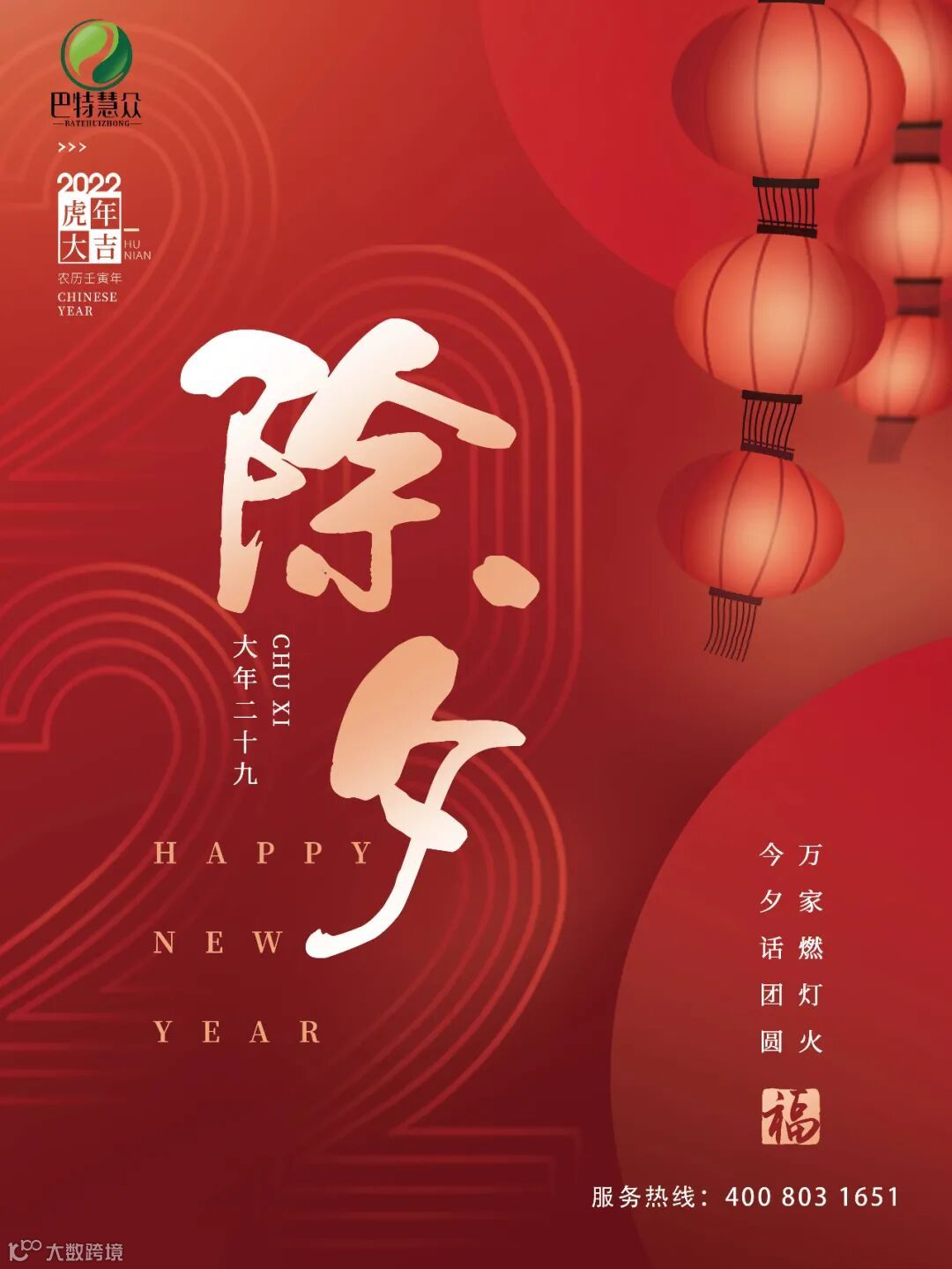 过年了,回首2021,意义非凡!展望2022,充满期待!此时此刻,我们心怀感恩,感谢每一位支持和鼓励我们的朋友,以最真挚的祝福,祝福朋友们新春快乐,身体健康,和顺致祥,幸福美满!